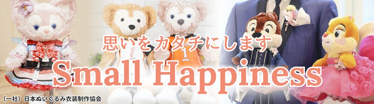 スモールハピネスは、大切なおもいを「カタチ」にしたいという思いから2010年より、ぬいぐるみ用衣装を専門に制作してます。お写真1枚から型起こしし、ワンランク上の品質・フルオーダーメイドのぬいぐるみ用衣装を制作しております。