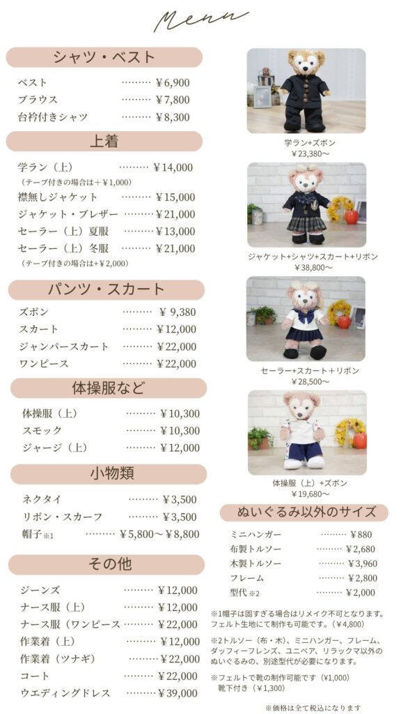 ・オリジナル木製トルソーサイズ、ハンガーサイズ、フレームサイズ及び、ダッフィー、シェリーメイ、ジェラトーニ、ステラルー、以外のぬいぐるみにリメイクする場合、別途型代¥2,000(税込)が必要になります。